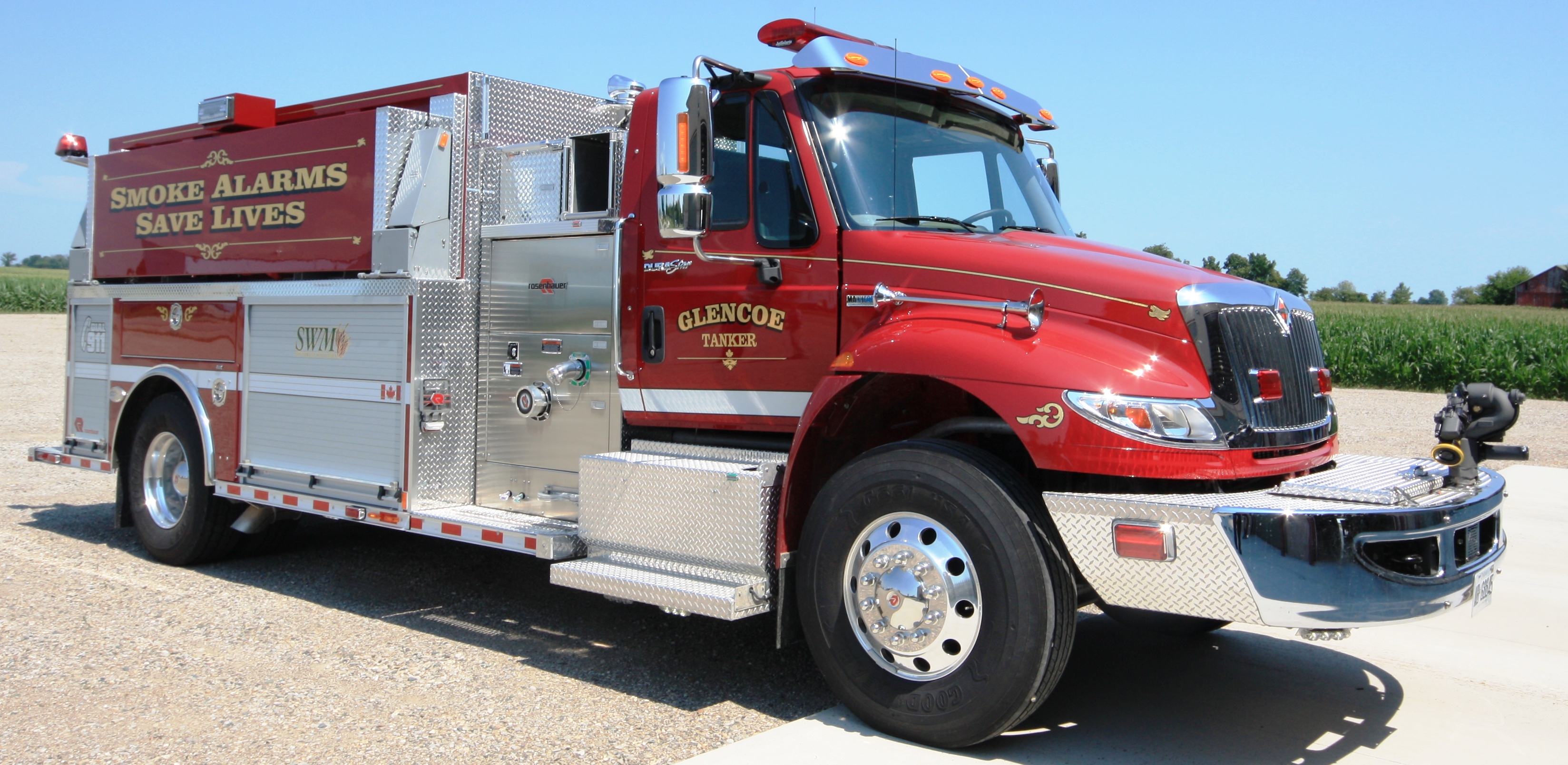 Accessories: Rosenbauer Maverick Pumper/Tanker, Rosenbauer FX Body, Front Bumper Mounted Elkhart Sidewinder EXM Monitor, Swivel Dump with Electric Valve, Electronically Operated Portable Tanker Storage, Two (2) 1 ½” Speedlays with removable trays, Side and Rear Camera System, High Pressure Booster Reel, Rear Traffic Advisor and EZ Climb Ladder.