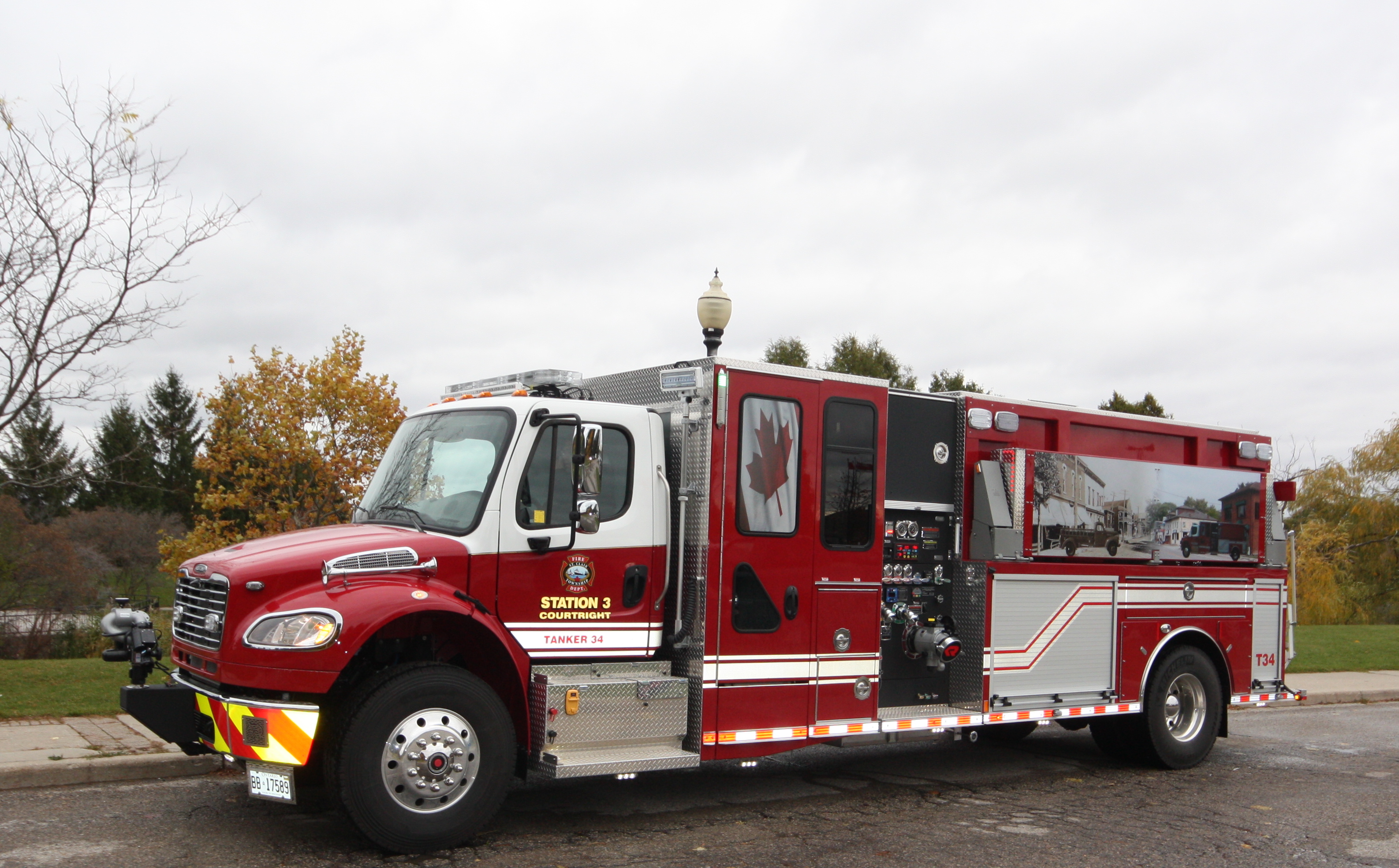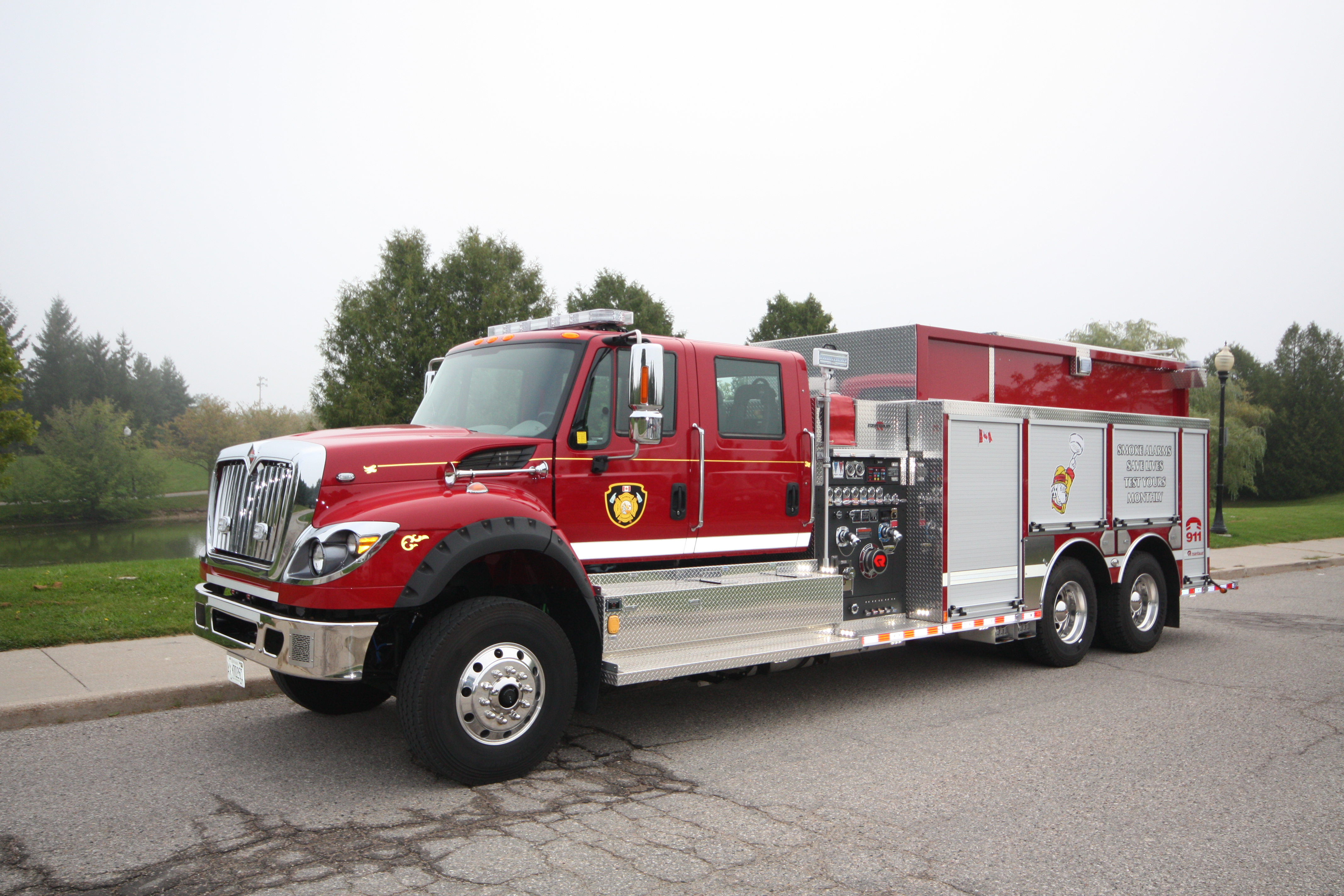 Accessories: Rosenbauer Pumper Tanker, Rosenbauer FX Body, FRC TGA 300 Pressure Governor, Foam Pro 1600 Foam System, FRC Scene Lighting, FRC Spectra Telescopic Lights, Firemans Friend Direct Tank Fill, Hydraulic Enclosed Folding Tank Carrier, Hydraulic Hosebed Covers, Rosenbauer EZ Climb Ladder, Swivel Dump and On-Spot Tire Chains.